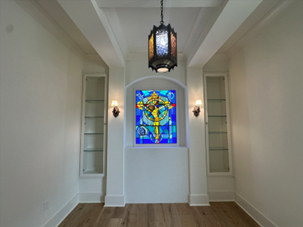 One of the most unique features was a private chapel, custom-designed as a serene space for reflection and prayer. Soft, calming tones, elegant lighting, and a beautiful custom stained glass insert made the room feel sacred and peaceful—truly a highlight of the tour.